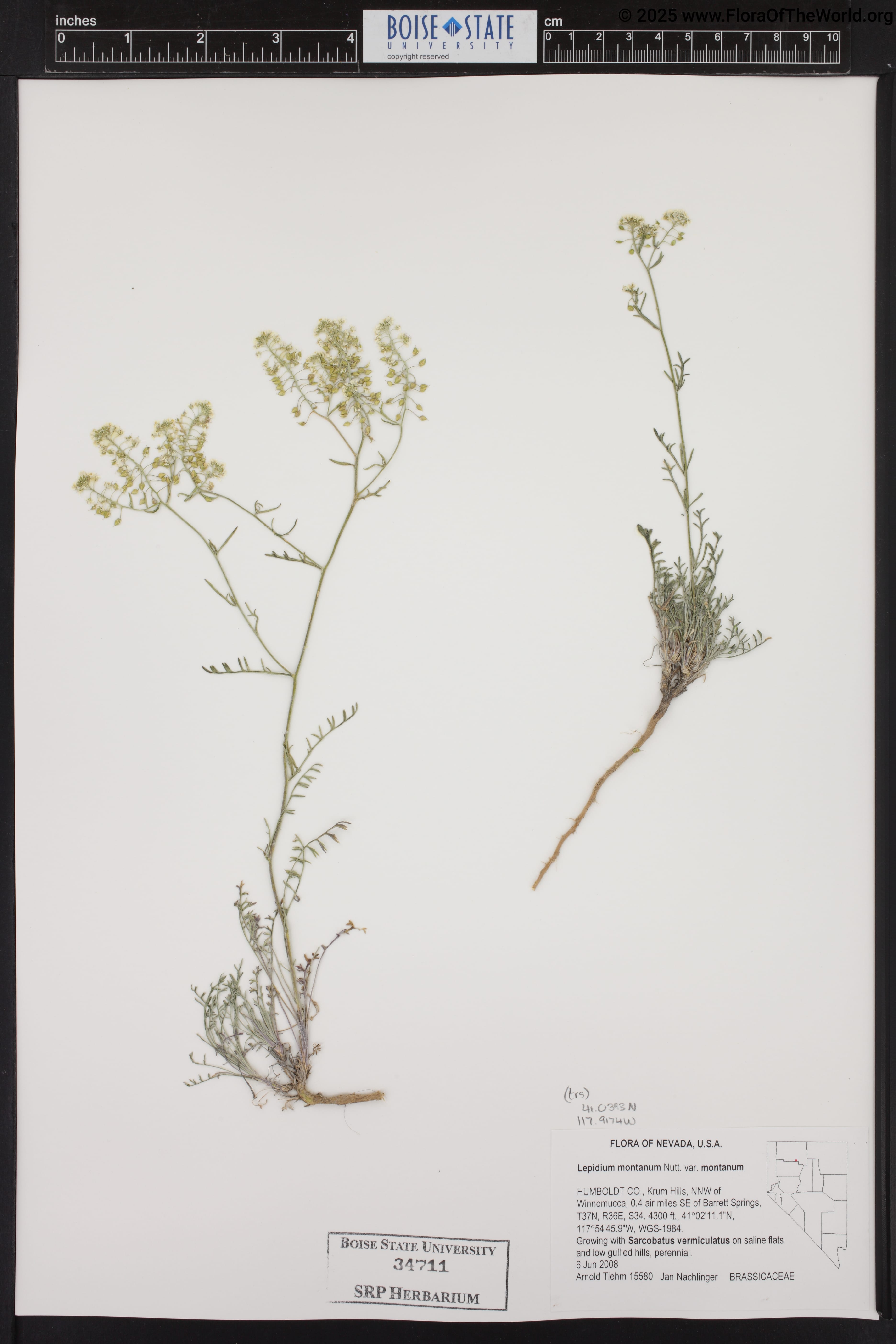 This occurrence of Lepidium montanum Nutt. (Tiehm A., Nachlinger J. 15580) was collected on 6/6/2008 in United States. Flora of the World includes 1 field photograph documenting this occurrence, all of which are displayed here.